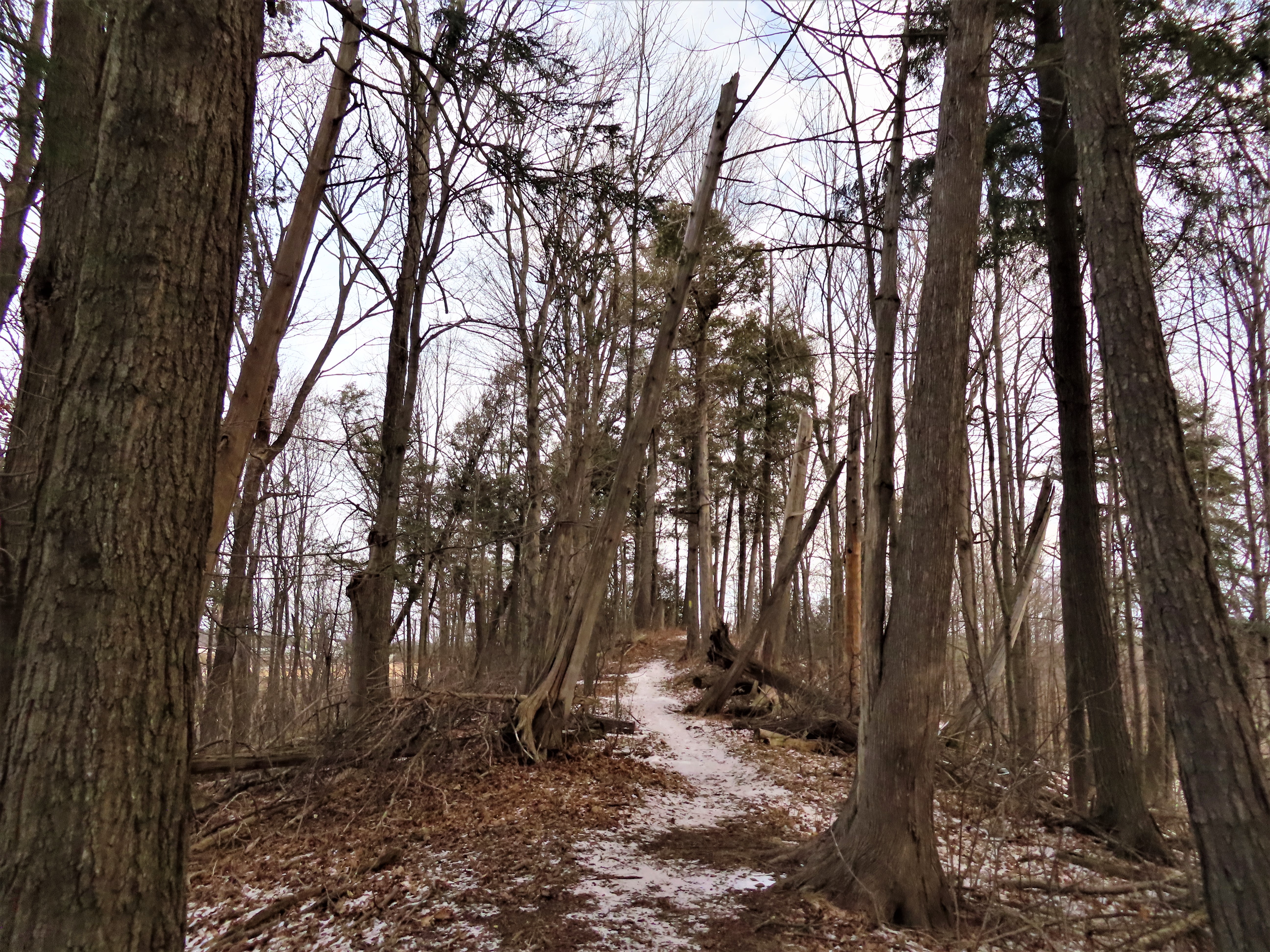 I followed the East Twin River Segment 1.3 miles (2.1km) to the North through a few sheltered cedar stands and many less sheltered hardwood stands. The hardwoods creaked and groaned as the wind gusted. The trail crossed, and then followed the East Twin River. The relatively easy terrain offered no steep sections, but ice can make a normally easy trail challenging. I stopped briefly at a nicely placed bench along the trail overlooking the river and took in the view of the giant Thompson Family Maple while eating a homemade granola bar.